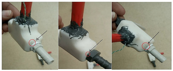 The experiment with pulsating flow starts to increase from 1.5 L/m to 2.5 L/m. This keeps the cell average output power constant from a 1.5 L/m to a 1.75 L/m flow rate (Figure 18). The increase in cell temperature is due to the extensive vibration experienced during the pulsating flow experiment approach adopted in this research. The vibration became more intense as the flow rate increased from 0.5 L/m to 2.5 L/m. Additionally, the vibration becomes more intense between 1.5 L/m and 2.5 L/m, which leads to cracks on the temperature sensor holders, as indicated with a red circle in Figure 18. This results in leakage and affects the pulsating flow’s cooling capability during the experiment between 2 L/m and 5 L/m. The system’s vibration has been highlighted as a challenge in applying pulsating flow [90,102]. This challenge and a more detailed and efficient approach to pulsating flow with CPV cooling would be an area to explore in the next stage of this research.