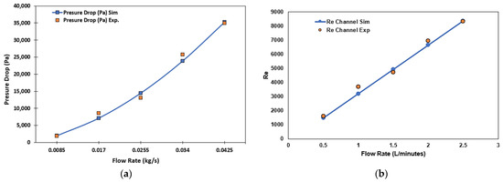 Figure 20a shows the pressure drops for both the experiment and simulation. Although it is not the same, both simulation and experiments agree. The pressure drop was calculated using Equation (14). With an increase in flow rate from 0.5 L/m to 2.5 L/m, the pressure drops increase from 1940.28 Pa to 35,240.40 Pa and 1896.30 Pa to 34,961.30 Pa for simulation and experiment, respectively. This agrees with [68], where it was reported that with an increase in flow rate, pressure drop increases. Figure 19b shows the flow rate’s effect on the Reynolds number (Re) for both simulation and experiment. As expected, an increase in flow rate increases the Re. With an increase in flow rate from 0.5 L/m to 2.5 L/m, the Re increased from 1617.56 to 8341.66 and 1482.41 to 8372.26 for experiment and simulation, respectively.