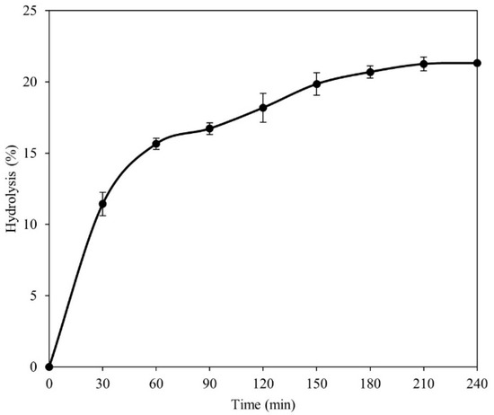 Hydrolysis reactions were performed in triplicate using a mixture of 5 g of commercial olive oil, 45 mL buffer acetate (pH 4.8), and 1 g of lipase extract powder. This mixture was agitated for 240 min using a mechanical stirrer at 1000 rpm, atmospheric pressure, and 25 °C. Samples of 1 g were periodically removed at intervals of 30 min. An amount of 10 mL of commercial ethanol was added to stop the reaction. Then, it was titrated against a standard 20 mmol/L sodium hydroxide solution in the presence of phenolphthalein as an indicator [18]. The hydrolysis degree was defined as the percentage weight of free fatty acids in the sample divided by the maximum theoretical amount using Equation (2) [18]: