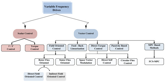 In IM control for nonlinear dynamical systems, rotor flux and currents are difficult to measure, and the heating of rotor resistance results in changes in resistance value. These challenging problems must be addressed. According to the IM voltage, velocity, flux current, and torque control, VFDs may be classified into two prime techniques, specifically, VC and SCC (Figure 2) [3,22].