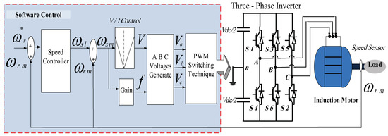 In the closed-loop control scheme, the frequency and variable voltage of the IM are always used for controlling the torque and velocity of IM drives [80]. To develop the IM’s dynamic response and performance, the V/f control approach is employed for IM drives. This approach provides many benefits, including a low steady-state error, simple architecture, easy design, and low cost.