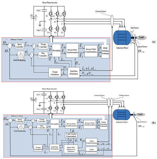 (a). Block diagram of DFOC via flux sensor for IM drive. (b). Block diagram of DFOC via rotor flux estimator or observer for IM drive.