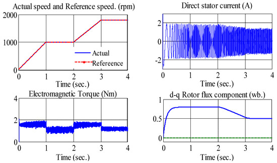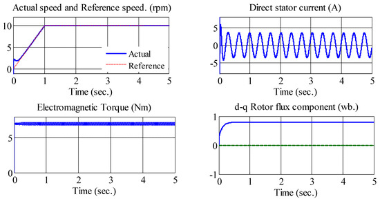 The dynamic performances of the DFOC method (based on Figure 5b with RFO) are presented in Figure 6, Figure 7 and Figure 8 (tested motor parameters are mentioned in Table 1). Via the Matlab/Simulink package, where the motor velocity is kept constant at and the load torque is assumed to be constant at the rated value , nominal motor parameters are assumed. Results show that the actual speed can track the command velocity trajectory; the velocity error among the actual and command velocities is small. In spite of the fact that the current is nearly sinusoidal, it contains some ripples that can be attributed to the PWM system. One of the largest ripples is presented in the d-axis flux component, which is constant at a rated flux (0.8 wb), while the q-axis flux component is almost equal to zero.