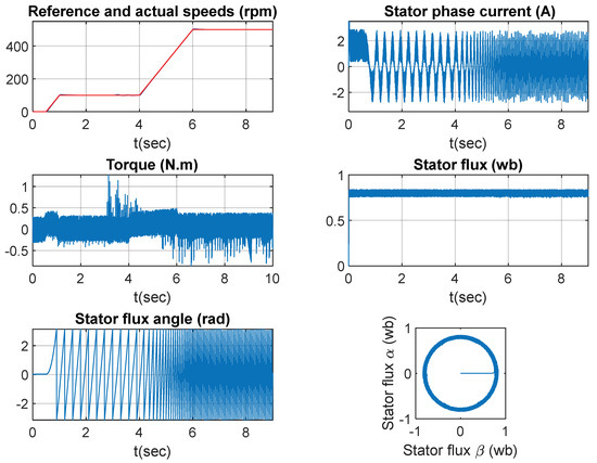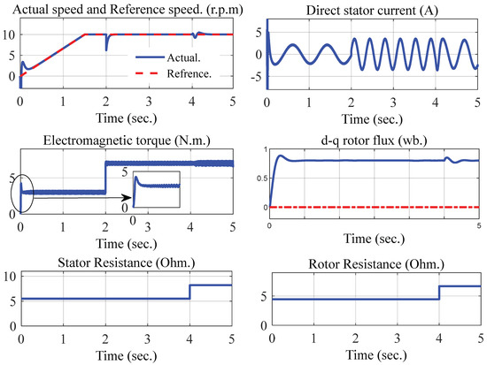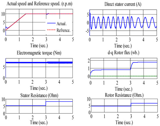 Figure 9 shows the dynamic performances of the IFOC method (based on RFO in Figure 8) at low speed, where the system is tested for load change (step change) from 3 Nm to 7 Nm followed by mismatching the resistances of the stator–rotor windings. However, there is a significant dip and overshoot of the motor speed owing to the step load disturbance, only a short time after a sudden increase in load to reach its steady-state speed. The proper setting of the PI controller gains of the motor speed loop minimizes speed dip and overshoot. These results also show that the torque exhibits high-frequency pulsations due to the PWM inverter, there is an increase in the current when the load is increased, and the d-axis flux component is constant at rated flux. However, it is the same dynamic performance problem as the DFOC concerning parameter mismatching as seen in the period 4–5 s.