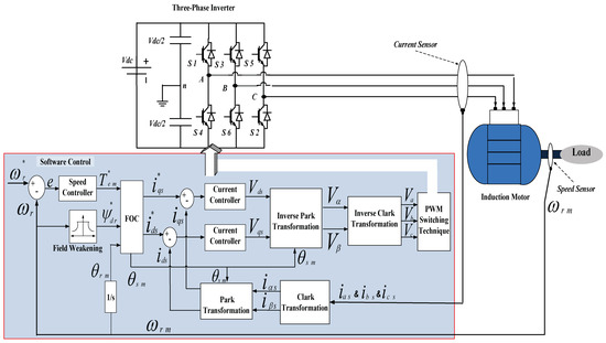 In late 1960, the innovation of field-oriented control (FOC) or the VC was a significant revolution in the field of IMs. In the past decades, IMs have been controlled using SCC techniques such as volt-hertz (V/f) control [5]. Due to its low cost, easy design, simple structure, and stumpy steady-state error, the SCC technique has been used in many studies [6,7,8]. In addition, it has a feature of stability in the middle to high velocity control and does not need IM parameters [9]. Many researchers have used this approach to control IMs (with DSP) [8,9,10,11], single [12] and five-phase IMs [13], and other AC drive systems (via DSP) [14]. However, the decoupling effect is not taken into account during scalar power. Due to the fact that torque and flux are dependent on voltage and frequency, as well as ups and downs in control parameters of either voltage or frequency, a change in either of these parameters will also change the torque and flux. In addition, the sluggish dynamic output is obtained by voltage magnitude and frequency regulation. By scalar control, the transient output is not enhanced, and it is additionally affected by IM parameter sensitivity [9,15,16].