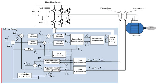 Various research has concentrated on methods of IM regulation. In 1946, Charp and Weygandt applied an analogue computer to examine the transient IM performance [75]. Bell Laboratories designed silicon-controlled rectifiers (SCR) or thyristors to control motors in 1956 [76]. Racz and Kovacs conducted new research in 1959 to analyze the rotating reference frames for transient IMs [77,78]. Power electronic devices were advanced at the beginning of the semiconductor revolution in 1960s to assist in designing many power electronic converters, such as inverters, rectifiers, and DC–DC converters. To control the IM drive, switching techniques were used. The VFD methods have therefore been developed and planned for control determinations in numerous research institutions. IMs were inspected for decreasing energy losses, implementing a control strategy of motors, and improving speed. In general, the universal IM control structure consists of four main portions: the IM, the three-phase-inverter, the control system, and the load, as displayed in Figure 1.