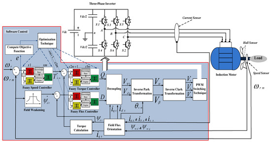 In 1965, Zadeh proposed the fuzzy logic controller (FLC) [41]. It has recently been used owing to its modified online control relative to adaptive modeling with unexpected event changes within systems [27,42]. In addition, the exact mathematical model is not needed for FLC; it can process both nonlinear and linear systems, and it is based on linguistic rules, which are the human logic cornerstones and the concepts from which it is derived [32,43,44]. Consequently, FLC has developed increasingly commonly in control system designations of numerous models [45,46,47]; it was utilized to improve the IM speed of scalar control [9]. In addition, FLC was also employed to regulate a five-phase IM [48].