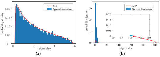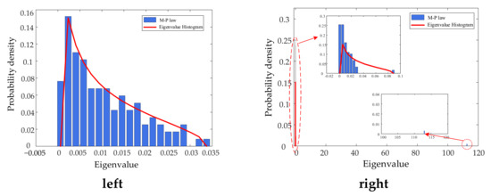 Sample data are extracted with a time sliding window of length T (T = 200), which is then used to reconstruct a sample random matrix of system states for analysis. After analysis, the M-P law diagrams of the system in stable operation and in case of failure are obtained, respectively, as shown in Figure 6.