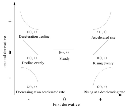 Trend identification is to match the results of trend extraction with trend primitives, each of which can be described by a tuple consisting of the first-order derivative and second-order derivative symbols of the fitted model [35], as shown in Figure 3, where seven different trend primitives reflect seven different patterns of variation.