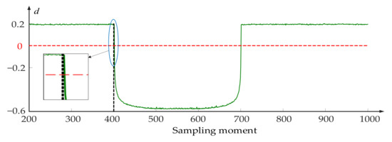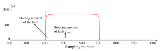 - In Figure 7, when the sampling moment is at t401, the curve coincides with the line drawn at the moment t401, while in Figure 8 the curve deviates from the drawn line. This indicates that the value of Δλ changes immediately after the system fault occurs, while the indicator d does not. It means that Δλ is more sensitive to capture the abnormal system state.
