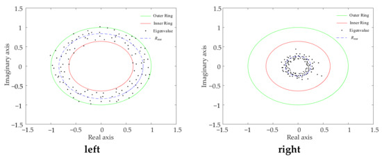 When the state of the physical system changes, the elements in the matrix change, causing Rmsr to change accordingly. When Rmsr > Rinner, it means that most of the eigenvalues are distributed inside the circle; then the system is stable. If the value of Rmsr is larger than the value of Rinner, the more stable the system is; conversely, the system is unstable. The indicator d is proposed to determine whether the eigenvalues are distributed within the circle as follows: