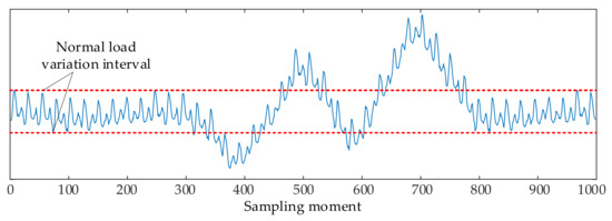 The load is changed in the manner of Figure 10. A total of 1000 sampling points are set in the simulation process. The system keeps normal stable operation before t300. From t301, the load gradually deviates from the normal operation interval and continues until t800. From t801, the disturbance is cleared, and the system resumes stable operation. The length of the time window for intercepting data is set to 200. Then the state matrix obtained from each time window interception is analyzed and calculated in turn.