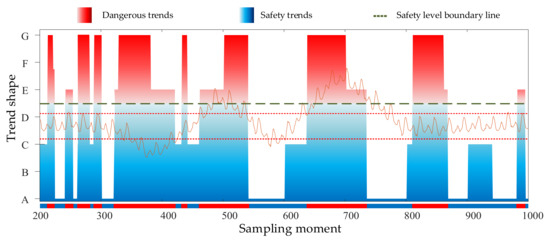 The safety level is defined for each trend segment according to Table 1, and the trend shapes of different safety levels are distinguished by color. As shown in Figure 13, the top of the safety level divider is the danger trend (red area), and the bottom is the safety trend (blue area). Also, red and blue colored progress bars are set at the bottom of the graph for tracking the duration of the safety and hazard trends. Because there are fluctuations in the system with a short duration of the trend shape, the dangerous trend time set must have a lower limit in order to avoid the small trend segments in the system that do not affect the d. Considering the error and margin, Example 2 sets this lower limit value of duration to 60. It means that the part of the dangerous trend duration exceeding 60 moments is considered as a bad trend where the load does exist. From Figure 12 it can be found that there are four dangerous trend segments that last for a longer period of time. By comparing with the load variation curve, it is found that the first three long dangerous trend segments correspond to the part of the load when it is outside the normal interval, so it can be seen that the abnormal load variation can be captured more accurately by analyzing the trend of d. At the fourth dangerous trend segment, it is found that the load has returned to within the normal interval but still shows a dangerous trend, which is due to the fact that the random matrix still contains a large amount of historical data with load perturbations when the data within the random matrix has just reached the t800 moment. Therefore, it can be considered that, whenever there is a long period of dangerous trend segments, there is a bad operating trend indicated in the current system.