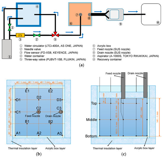 A schematic of the experimental setup for temperature data collection is shown in Figure 1. A water circulator (No. 1) was used for heating, cooling, and circulation of water. Water in an acrylic box (No. 6) was initially adjusted to a constant designated temperature, the initial temperature, to simulate the initial state of the air-conditioned room. After the cold water in a water container (No. 4) reached a constant designated temperature, the feed temperature, the cold water was continuously supplied to the acrylic box through a feed nozzle (No. 7) to simulate the operating state of the air-conditioning cooling model. The excess water in the acrylic box was removed by an aspirator (No. 9) through a drain nozzle (No. 8) and discharged into a recovery container (No. 10). A three-way valve (No. 5) was used to control the start and stop of the water supply. Two needle valves (No. 2) were used to adjust the flow rate. In addition, 39 K-type thermocouples (13 horizontal × 3 vertical) were installed at different locations inside the acrylic box for temperature collection. Figure 1b,c show the specific positions of thermocouples, with an equal distance between different layers and symmetrical distribution at the same layer. The acrylic box was wrapped with thermal insulation, and the interior of the box was fitted with thermal insulation to simulate the ceiling. The thermal conductivity of thermal insulation was 0.028 W/(m·K). The feed temperature was measured using a K-type thermocouple in the feed nozzle. The experimental conditions for temperature data collection were set as follows: the initial temperatures were 25 and 35 °C, the feed temperature was 10 °C, the flow rates were 770 and 850 mL/min, and the sampling time was 100 ms.