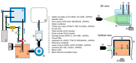 A schematic of the experimental setup for flow visualization is shown in Figure 2. The main difference compared with the temperature data collection setup was the addition of a tracer filter (No. 10), a syringe pump (No. 9), a laser source (No. 13), and a camera (No. 14). The water circulation method of flow visualization was the same as that of the temperature data collection. The tracer particle flowed into the feed water using the syringe pump. The central cross-section of the acrylic box (entire C surface) was vertically illuminated by the laser source. The illuminated surface was observed using the camera installed in front of the acrylic box. The flow regime was analyzed using the particle image velocimetry (PIV) method (PIV software: FLOW EXPERT 2D2C Ver.1.3.3.1, Kato Koken, Japan). The experimental conditions of flow visualization were set as follows: the tracer particle was a fluorescent red polyethylene microsphere (UVPMS-BR-0.995, COSPHERIC LLC, USA) with a diameter of 75–90 µm and a density of 0.995 g/cm3, the frame rate of the video was 120 fps, the initial temperatures were 25 and 35 °C, the feed temperature was 10 °C, and the flow rate was 770 mL/min.