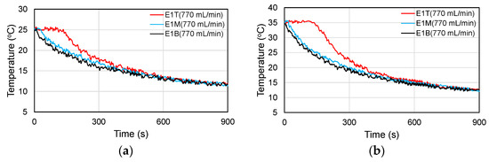 Temperatures variation comparisons between E1T, E1M, and E1B under the flow rate of 770 mL/min: (a) the initial temperature of 25 °C; (b) the initial temperature of 35 °C.