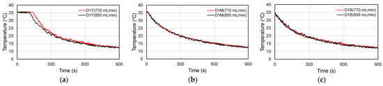 Temperatures variation comparisons between flow rates of 770 and 850 mL/min at the initial temperature of 35 °C: (a) top layer; (b) middle layer; (c) bottom layer.