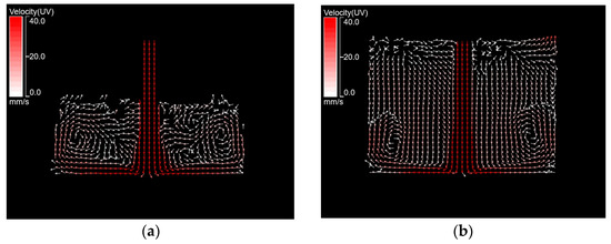 Mean velocity vectors under the initial temperature of 35 °C and flow rate of 770 mL/min: (a) the elapsed time of 90 s; (b) the elapsed time of 540 s.