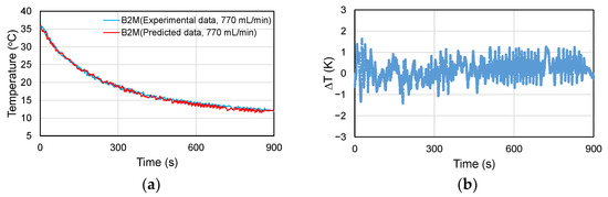 The training data at B1M are fitted well by the C1M-B1M model, with an R2 value of 0.993. The validation result of the C1M-B1M model is shown in Figure 6. The experimental data of B2M agree well with the predicted data, with an MAE value of 0.38 K. ΔT can be controlled within about ±1 K. Therefore, good accuracy is obtained by the C1M-B1M model under the initial temperature of 35 °C and flow rate of 770 mL/min.