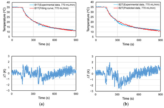 The model with the flow rate of 850 mL/min is obtained using the same method as that of 770 mL/min. The coefficients, R2, and MAE of the model at the flow rate of 850 mL/min are shown in Table S1 of Supplementary Materials. The R2 values of 0.977–0.998 and MAE values of 0.15–0.62 K demonstrate the acceptable accuracy of the model at the flow rate of 850 mL/min.