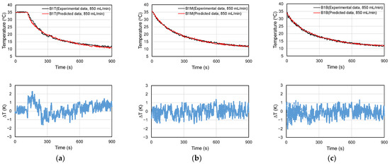 Figure 8 shows the results of using the model for 770 mL/min to predict the experimental data of 850 mL/min. The MAE values of B1T, B1M, and B1B at the initial temperature of 35 °C are 0.55 K, 0.42 K, and 0.43 K, respectively. At the same time, the experimental data of 770 mL/min are predicted by the model for 850 mL/min. The MAE values of B1T, B1M, and B1B at the initial temperature of 35 °C are 0.50 K, 0.42 K, and 0.42 K, respectively. Both validations using the model for one flow rate to predict the experimental data of another flow rate have acceptable accuracy. In the case of a 10% difference between the flow rates, it can be considered to use one model for prediction.