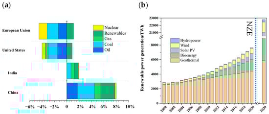 Global energy demand by region and fuel: (a) change in fuel in 2021 relative to 2019 [2]; (b) trends of renewable installation capacity [3].