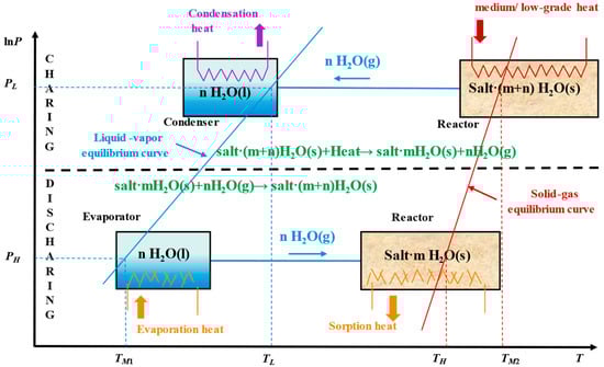 Energy storage technologies are abundant, for example, pumped hydrostorage (currently dominant, accounting for ~95% of global installations), compressed air energy storage with a share of ~1%, thermal energy storage (taking ~2% share of global installations), and electrochemical energy storage (mainly lithium-ion batteries, taking ~2%) [5]. These numbers are mere approximations, and the literature often ignores specific data on thermal energy storage. However, a recent report by the Renewables 2021 Global Status Report (GSR) shows that thermal energy accounts for over 50% of global final energy consumption, highlighting the importance of thermal energy [6]. The preliminary results of a recent UK Royal Society study show that the future zero-carbon energy system requires short-, medium-, and long-term energy storage [7]. For the UK alone, a future renewable energy-dominant energy system requires ~100 to 120 GW/100–200 GWh for short-term storage, ~100 to 130 GW/2–6 TWh for medium-term storage, and 70–80 GW/35–40 TWh for long-term storage [8]. A significant amount of work has attempted to address short-term energy storage, e.g., lithium-ion and sodium-ion batteries, supercapacitors, and flywheels [9,10,11,12], whereas medium- and long-term energy storage types require less effort. For long-term energy storage, high energy density, low energy losses during storage, and low costs are among the top key performance indicators (KPIs) for technology development. Thermal energy storage (TES) has the potential to meet these requirements. For example, solar heat in most countries exceeds the total heat demand in the summer, whereas the reverse occurs in the winter when the heat demand exceeds the solar energy supply. TES can be further subdivided into three subcategories: sensible heat storage (SHS), latent heat storage (LHS), and thermochemical energy storage (TCES). Figure 2 shows the working principle of the salt hydrate adsorption-based TCES system [13], which is cyclically operated as illustrated by the liquid/vapor equilibrium line and the solid/gas equilibrium line in the Clausius-Clapeyron diagram. The two modes of operation are charging (desorption) and discharging (adsorption) for heat energy storage (for cold energy storage, the process is reversed). This work focuses on heat energy storage. In the charging mode, the salt hydrate is heated by a heat source, releasing water vapor to yield a salt hydrate with fewer or zero water molecules, and then heat energy is converted into chemical energy and stored in salt. The stored heat is released when water vapor reacts with the salt. Figure 3 shows the characteristics of these TES technologies, of which the thermochemical-based TES (TCES) could meet the needs of seasonal storage owing to the proper adoption of KPIs (e.g., high energy density and zero loss during storage). However, it has the disadvantage of complex technology and high one-time investment in practical application. SHS systems have good security and excellent heat transfer performance, but the energy density is low and the loss is large. LHS systems, which take advantage of latent heat of phase change, have been attracting notable attention to achieve medium energy storage density compared with the other two heat storage approaches in view of system convenience and operating stability. The latest research includes a novel energy storage tank filled with phase change materials with graded metal foams, which notably helps the melting and solidification processes [14], multi-tube shell, and tube units by increasing the number of tubes, which reduces both the charging and discharging times [15], and a hydronic system equipped with evacuated tubes integrated within a hot water tank to improve in the thermal performance of energy storage [16].