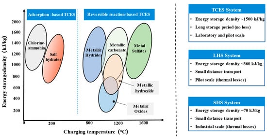 TCES technology (left) and some characteristics of TES systems (right). Energy density data are typical and approximate. Note: The boxes in right represent the main characteristics of thermochemical energy storage (TCES) system, latent heat storage (LHS) system, and sensible heat storage (SHS) system, respectively.