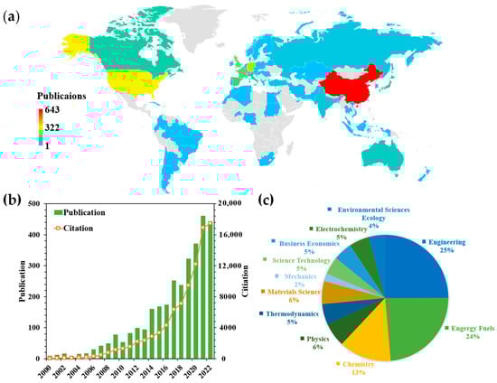 Global publications on the TCES technology (2000–2022): (a) geographical distribution; (b) publications and citations; (c) research area.