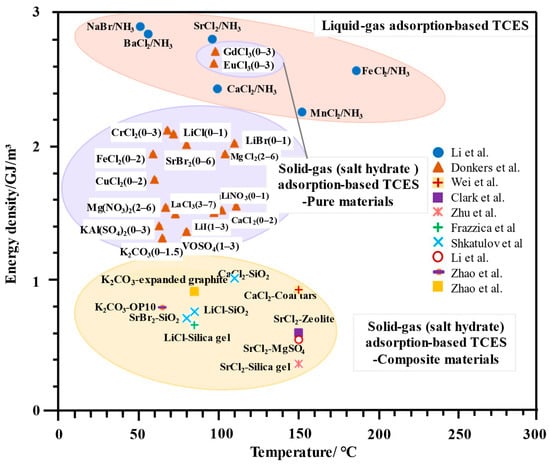 TCES can be further subdivided into adsorption-based and reversible reaction-based technologies (Figure 2). Adsorption-based TCES mainly includes two types: liquid-gas and solid-gas types. As shown in Figure 5, pure adsorption materials have higher energy density, especially for salt hydrates, which are environmentally friendly, low cost, and safe to use and are more suitable for low-temperature TCES systems than ammonium salts.