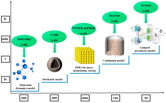 However, pure salt hydrates are prone to agglomerating and even melting if overhydrated, limiting the transport of water vapor and decreasing the cyclic stability [27,28,29,30,31,32,33]. Therefore, recent efforts to address this challenge include the use of composite structures for loading salt hydrates into the porous matrix, which forms the main part of this review. For the composites, the energy density is significantly lower than that of the pure material mainly because of the addition of the matrix, preparation method, salt content, and other factors. The principle of salt hydrate-based thermochemical energy storage, involving the adsorption (discharging) and desorption (charging) processes of salt (solid-state), is a multiscale problem, from the molecular to the system scale. An overview of the scales involved in the problem and the approaches to modeling are summarized in Figure 6. The studies on the molecular scale of composite particles are limited. Future studies can focus on the migration rules and phase transition paths of water molecules to obtain the microscopic mechanism of adsorption and desorption as guidance for controlling the process in macroscopic reactions. The microstructure of the porous matrix also has a key influence on the performance improvement of composite materials, which will be discussed in this paper. A balance between energy storage performance and the increase in the reaction rate in the reactor cannot always be satisfied. Considering the reaction conditions of the material, the finned structure is the preferred choice to solve this problem.