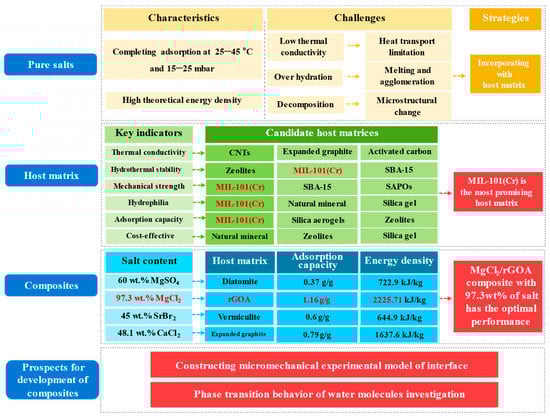 The major contents of this review of salt hydrate adsorption-based TCES materials: Dark blue in the leftmost column indicates the subjects studied in Section 2 and 3. Light yellow indicates the characteristic and challenges on pure salt. Dark yellow indicates the main strategy adopted to face the challenge of pure salt. Light and dark green indicates key indicators of the host matrix as well as candidates, respectively. Blue in the middle column indicates the adsorption/desorption performance on composite materials. Dark red indicates the main conclusions reached and the future direction of composites.