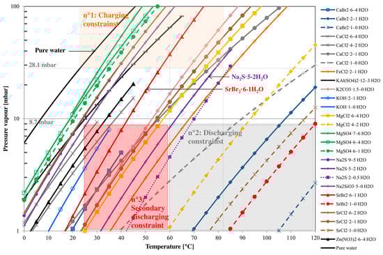 In the process of adsorption and desorption, temperature and pressure interact and influence each other, especially at low temperatures, and water vapor pressure is unfavorable for heat and mass transfer processes. Therefore, the appropriate reaction equilibrium conditions must be determined. The solid-gas equilibrium curves and thermodynamic constraints for the adsorption/desorption processes of the pure salt hydrate materials are summarized in Figure 8 [40,41,42,43,44]. Most pure materials, such as SrCl2·6H2O, K2CO3·1.5H2O, Na2S·9H2O, MgSO4·7H2O, MgCl2·6H2O, LiCl·H2O, CaCl2·6H2O, and SrBr2·6H2O, can achieve complete adsorption saturation in the range of 25 to 45 °C and 15–25 mbar, and their thermophysical properties, including melt pointing, thermal conductivity, and reaction enthalpy, are mainly discussed in this section.