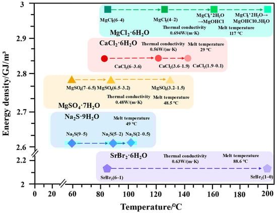 The thermal conductivity of salt hydrates related to heat transfer strongly affects the adsorption and desorption rates when considering practical applications. Some results [59] highlighted that the thermal conductivity of the hydrate is higher than that of anhydrous, given the larger porosity for anhydrous thermal conductivity, such as 0.63 W/(m·K) and 0.44 W/(m·K) for SrBr2·6H2O and SrBr2, respectively. As shown in Figure 9, MgSO4·7H2O, MgCl2·6H2O, and CaCl2·6H2O also have low thermal conductivities ranging from 0.4–0.7 W/(m·K) according to the measurements and experiments. Candidate materials with higher reaction enthalpies are preferred in TCES systems. The reaction enthalpies of each step for salt hydrates widely used in space heating are summarized in Table 2.