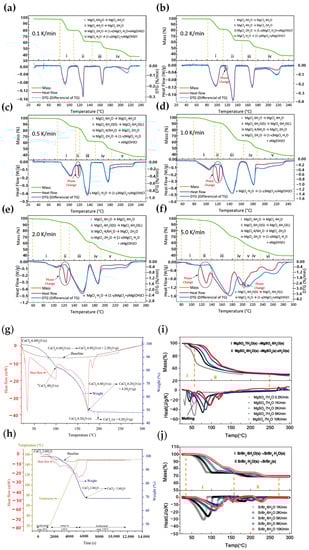 Heat flow curves: (a–f) MgCl2·6H2O [49]; (g,h) CaCl2·6H2O [65]; (i) MgSO4·7H2O [51]; and (j) SrBr2·6H2O [51]: Reprinted with permission from Ref. [49]. Copyright © 2020 Elsevier B.V. All rights reserved; permission from Ref. [64]. Copyright © 2020 Elsevier B.V. All rights reserved; permission from Ref. [51]. Copyright © 2019 Elsevier B.V. All rights reserved.