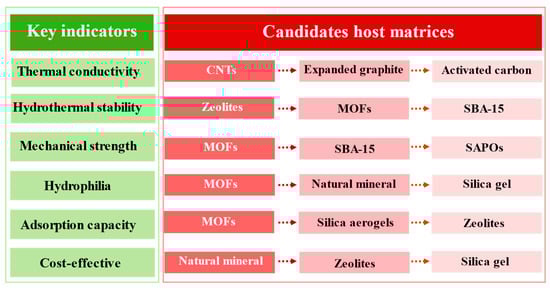 Salt hydrate composites can be obtained by impregnating salt into a structural material covering micropores (pore size < 2 nm), mesopores (2 nm < pore size < 50 nm), and macropores (pore size > 50 nm). These porous materials with larger pore volume, specific surface area, and pore size not only provide support for the salt hydrates, allowing them to be evenly distributed while increasing the contact surface area and mass transfer channels for water vapor transport, which is beneficial for the adsorption capacity. The basic characteristics of common and potential host matrices are shown in Table 5 and Table 6, respectively. Carbon-based materials (e.g., expanded natural graphite, carbon nanotube, activated carbon fiber felt, and foam), alumina-silicates (e.g., zeolites, activated alumina), silicates (e.g., silica gel, silica aerogels, Wakkanai siliceous shale, MCM-41, and SBA-15), and natural mineral clays (e.g., bentonite, goethite, kaolinite, and attapulgite (palygorskite), expanded perlite, sepiolite, diatomite, (expanded) vermiculite, and hydroxyapatite, among others) have been applied widely to support pure salt hydrates in TCES systems. Some potential matrices, including metal-aluminophosphates (e.g., AlPOs, SAPOs, VAPOs, and TAPOs, among others), metal–organic frameworks (MOFs, e.g., MILs, UiOs, PCNs, DUTs, BUTs, NUs, and ZIFs), and microporous/macroporous silicon foam, have been gradually developed in recent years and may be regarded as promising porous materials in the future. The key indicators to be considered in the application of composite materials as matrices consist mainly of higher thermal conductivity, hydrothermal stability, mechanical strength, hydrophilicity, adsorption capacity, and cost-effectiveness. Candidate materials are prioritized from front to back, as shown in Figure 13. The dashed arrows indicate that the performance of candidates’ host matrices decreased in sequence according to the key indicators. A more in-depth discussion of the above-mentioned matrices is given below.