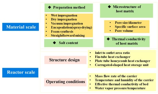 Previous studies have summarized advances in devices and systems based on salt hydrates and presented current challenges, but only a few studies have systematically classified and summarized the characteristics of host matrices supporting salt hydrates from the perspective of enhancing the energy storage performance of composites in TCES systems. Furthermore, the relationship between salt loading and the improvement of adsorption properties needs to be further analyzed. In line with the need to solve the abovementioned problems, this work focuses on candidate salt hydrates and summarizes their thermophysical properties and reaction kinetics. In addition, various host matrices were classified according to structure type, and the potential host matrix for incorporation with the salts was screened. Then, an in-depth discussion on the correlations between salt content and the adsorption capacity and energy density was given, further explaining how the microstructure and thermal conductivity of the host matrix affected the reaction kinetics and thermal behavior of the composites. Finally, at the device scale, the dependence of operating conditions and structural design on performance optimization was proposed. This article is structured in the following manner (Figure 7). The main content about salt hydrates adsorption material-based thermochemical energy storage for space heating applications is discussed in Section 2. Section 2.1 provides details of the thermophysical and reaction kinetics based on pure materials. Section 2.2 summarizes and screens promising host matrices. The contributing factors for the adsorption and desorption performance of the composites are analyzed in Section 2.3. The prospects for the development of the area are discussed in Section 3. Finally, conclusions are given in Section 4.