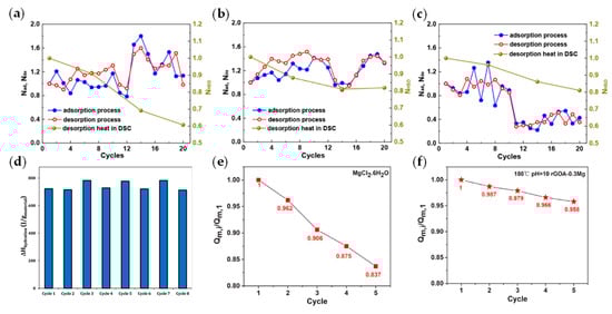 Alumina-silicate adsorbents, such as activated alumina (AA) and zeolites, have been proven to be excellent host matrices owing to their higher porous structure and bulk density, and their microstructure is shown in Figure 14e,f [106,107]. The structural stability of AA is rarely fragmented in adsorption/desorption cycles [108], whereas for zeolites, the weak mechanical strength can lead to performance degradation and sorbent losses [106] and a higher desorption temperature of 130 to 180 °C, which is unfavorable to the reaction process. In addition, more advantages exist in zeolites and zeotype matrices, such as uniform pore size distribution [109], strong hydrophilicity [110], higher water uptake at high humidity [111], energy density of 107–185 kWh/m3 [112], and better thermal and hydrothermal stability. Ion-exchange characteristics in zeolites allow for tuning their adsorption capacity. A 42% increase in water uptake was achieved by stirring zeolite with magnesium nitrate solution at P/P0 = 0.2. However, no obvious increase in the water uptake capacity and characteristic adsorption energy of Mg/Na-Y zeolites was observed when the ion exchange degree exceeded 64.1% [109].