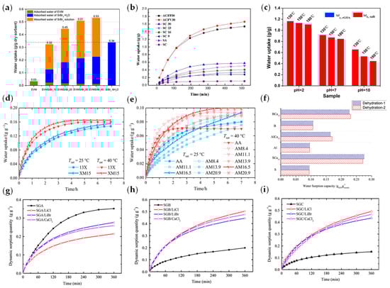 For natural mineral materials (bentonite, goethite, kaolinite, attapulgite (palygorskite), expanded perlite, sepiolite, diatomite, vermiculite (expanded), and hydroxyapatite, among others), their cost-effectiveness, ease of access, and (chain) layered structure (Figure 14g for attapulgite [113] and Figure 14h for expanded vermiculite [114]) provide many adsorption sites. In particular, the diatomite presented a flat round shape with a large number of pores inside the particles (Figure 14i) and excellent hydrophilicity [115], promoting the mass transfer of water vapor and significantly increasing the water uptake capacity [115,116,117,118]. Hydroxyapatite (HAP), as a member of the calcium phosphate family, has a higher heat transfer performance (a thermal conductivity of 0.15–0.2 K) [119]), and biocompatibility with surrounding materials. Nevertheless, insufficient thermal and hydrothermal stability for these mineral materials may be an obstacle to practical application.