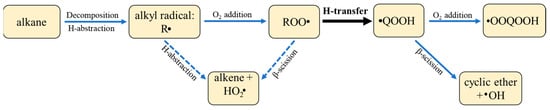Additionally, as is widely known, the low-temperature chemistry of saturated alkanes is much more complicated than the high-temperature chemistry. Figure 1 shows the main reaction pathways at low temperatures for alkanes [,]. Initiated with O2 or through decomposition, alkanes decompose to alkyl radicals, which then undergo O2 addition to form alkylperoxy radicals (ROO radicals). Then, the ROO radicals undergo isomerization to yield hydroperoxylalkyl (QOOH) radicals. Dissociation of QOOH radicals produces cyclic ethers, regenerates active hydroxyl radicals, and initiates secondary O2 addition reactions. The active hydroxyl radical delivered by the QOOH radicals plays an important role in enhancing the low-temperature oxidation of hydrocarbons. As the first reaction step, ROO radicals’ transformation into QOOH radicals becomes the starting channel for the initiation of the low-temperature pathways.