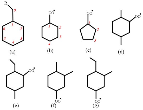 Molecular structures of cyclic alkanes studied in this work. (a) alkylated cyclohexane (b) cyclohexylperoxy radical (c) cyclopentylperoxy radical (d) dimethylcyclohexylperoxy radical (e) ethyl-methyl cyclohexylperoxy radical (f) trimethylcyclohexylperoxy radical (g) ethyl-dimethyl cyclohexylperoxy radical.