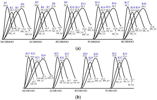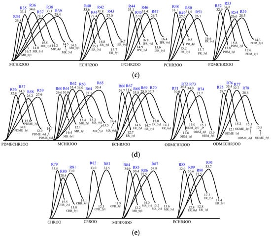Potential energy surfaces (PESs) of cycloalkylperoxy radicals in kcal/mol. (a) PESs of the radicals MCHR0OO, ECHR0OO, IPCHR0OO, PCHR0OO, BCHR0OO, MCHR0OO_1yl, ECHR0OO_1yl, IPCHR0OO_1yl, etc., are abbreviated as MR_1yl, ER_1yl, IPR_1yl, etc. (b) PESs of the radicals MCHR1OO, ECHR1OO, IPCHR1OO, PCHR1OO, MCHR1OO_2yl, ECHR1OO_2yl, IPCHR1OO_2yl, etc., are abbreviated as MR_2yl, ER_2yl, IPR_2yl, etc. (c) PESs of the radicals MCHR2OO, ECHR2OO, IPCHR2OO, PCHR2OO, PDMCHR2OO, MCHR2OO_3yl, ECHR2OO_3yl, IPCHR2OO_3yl, etc., are abbreviated as MR_3yl, ER_3yl, IPR_3yl, etc. (d) PESs of radicals PDMECHR2OO, MCHR3OO, ECHR3OO, ODMCHR3OO, ODMECHR3OO, PDMECHR2OO_1yl, MCHR3OO_1yl, ECHR3OO_1yl, etc., are abbreviated as PDME_1yl, MR_1yl, ER_1yl, etc. (e) PESs of radicals CHROO, CPROO, MCHR4OO, ECHR4OO, CHROO_2yl, CPROO_2yl, MCHR4OO_1yl, etc., are abbreviated as CHR_2yl, CPR_2yl, MR_1yl, etc.