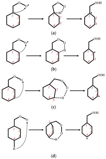 H-transfer reaction types from the cycle to the side chain. (a) 1,4-H transfer, type one; (b) 1,5-H transfer, type two; (c) 1,6-H transfer, type two; (d) 1,7-H transfer, type three.