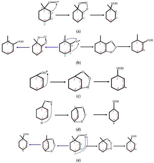 Figure 5 presents representative H-transfer reactions occurring on the carbon ring. As discussed above, there are two or three common carbon atoms in the two cycles of the transition state molecules. First, peroxyl obtains an H atom from its neighbor carbon site via 1,4-H transfer with a TS, and the newly formed cycle shares two carbon atoms with the original carbon ring. Although the 1,4-H transfer occurs from the secondary site to the tertiary site (Figure 5a) and from secondary/tertiary sites to the secondary site (Figure 5b), no differences were distinguishable in the energy barriers for these types. All of them were in the range of 32.7 kcal/mol to 35.5 kcal/mol. The energy barriers were greater than for the 1,4-H transfer type from the carbon ring to the side chain discussed above. According to a previous study, the energy barrier of 1,4-H transfer for alkane radicals amounts to 23–31 kcal []. It can be suggested that the inner strain energy of the bicyclic ring in the TS structure elevates the energy barrier of the 1,4-H transfer reactions in the carbon cycle. This reaction type is denoted type four in this work. Figure 5c,d depict representative reaction channels for 1,5- and 1,6-H transfer from secondary to secondary sites. The 1,5-H transfers to secondary sites occurring on the carbon ring, denoted type five, have obviously lower energy barriers, ranging from 26.2 kcal/mol to 28.6 kcal/mol. There are three common carbon atoms shared between the original cycle and the newly formed cycle in the transition states. In comparison, the 1,5-H transfer for alkane radicals has an energy barrier of less than 24 kcal [], which is lower than that of the H-migration reaction in the carbon ring. The 1,6-H transfer that occurs between two opposite carbon atom sites on the ring has a higher energy barrier than the 1,5-H transfer, with a range of 31.0–33.1 kcal/mol. This type of reaction is denoted type 6 and includes 1,6-H transfer to secondary carbon sites from secondary or tertiary sites. Figure 5e shows the 1,5-H and 1,6-H transfers from the secondary to tertiary sites, which were picked out as another reaction type denoted type seven. Due to the tertiary C-H bond being almost vertical with respect to the main carbon ring, the ring strain energy of the 1,5-H transfer becomes greater, albeit smaller than that of the 1,6-H transfer smaller, resulting in energy barriers in the range of 29.6–30.7 kcal.