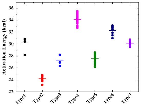 Figure 6 summarizes the activation energies for all reaction classes. It can be clearly seen that 1,5-H transfer reaction types have lower activation energies than other reaction types, while 1,4-H transfer reactions have 6–8 kcal/mole higher energy barriers than the 1,5-H transfer types for the two categories of H-migration from cycle to chain and in cycles. On the other hand, H-migration on the carbon ring tends to show a higher energy barrier than H-transfer from cycle to chain for similar transition-state molecular structures.