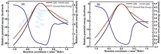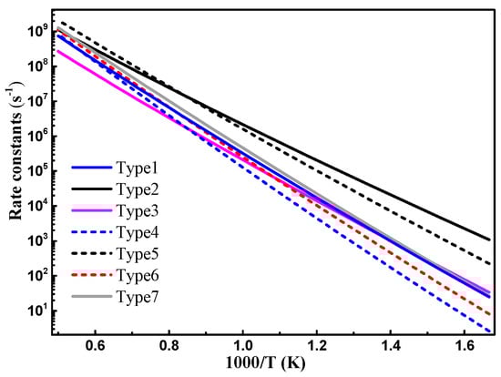 In accordance with the findings discussed above, the rate constants for all reactions were computed from temperatures of 600 K to 2000 K using the TST method. Then, the data were fitted in the form of the Arrhenius formula, which is shown in Equation (4).