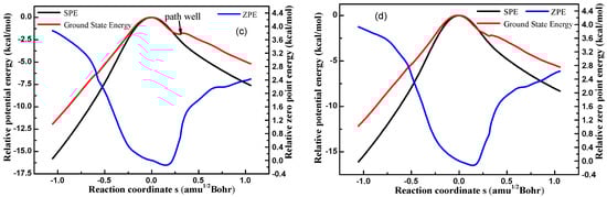 The minimum energy path (MEP) is the steepest descent from the saddle point down to reactants and products in the mass-scaled Cartesian coordinate system. It is calculated point by point with a step size of 0.01 amu/bohr. In Figure 7, the MEPs for the reactions for radical MCHER2OO are illustrated as an example. In each panel, the single point energies relative to that of the saddle point are plotted along the MEP combined with the relative ground state energy. The ground state energy is computed as the sum of the single point energy and zero point energy. It can be seen that, for every reaction, the peak ground state energy and single point energy are almost identical with the saddle point. This suggests that the adoption of the saddle point as the bottleneck of the pathway is reliable. There is a sharp decrease and increase in the zero point energy along the MEP, leading to paths that can be observed well in the curves of the ground state energy. However, the peak is not altered.