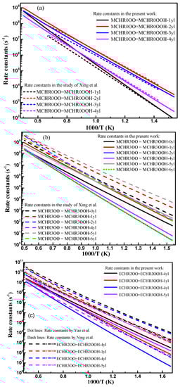 High−pressure limits (HPLs) of H−transfer reactions for several alkylperoxy radicals. (a) HPLs for the MCHR0OO radical in the present work and the study by Xing et al. (b) HPLs for MCHR3OO in the present work and the study by Xing et al. [] (c) HPLs for ECHR2OO and ECHR3OO in the present work and the studies by Yao et al. [] and Xing et al. [].