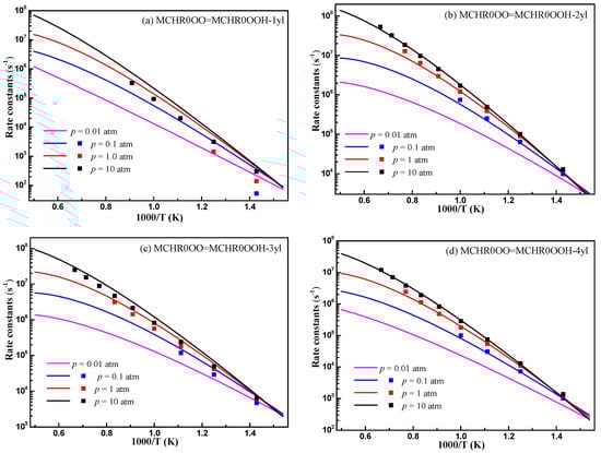 In addition, the pressure-dependent rate constants at pressures of 0.01–10 atm for the decomposition of the MCHR0OO radical are shown in Figure 9. As expected, rate expressions decrease with decreases in pressure. The influence of pressure on the rate constants increases as the temperature increases. It should be pointed out that the rate constants at p = 10 atm approximate the high-pressure limits. The close lines of the rate expressions between pressures of 10 and 1 atm indicate quite weak pressure effects. This suggests that the pressure influence on such H-transfer reactions is not very strong in comparison with other β-scission channels. Furthermore, Xing et al. [] computed pressure-dependent rate constants for the reaction channels of the MCHR0OO radical, including OH elimination and subsequent decomposition, in addition to the H-transfer. Their data were employed for a comparison with the present data. Fairly acceptable agreement is shown in Figure 9, especially for the reactions forming MCHR0OOH-2yl and MCHR0OOH-4yl, in which the scatter point (data from Xing et al.) overlaps with the solid lines (present data). The difference for the reaction yielding MCHR0OOH-3yl is within a factor of 1.4, while it is greater than a factor of 3 for the reaction forming MCHR0OOH-1yl. In general, it is safe to conclude that the pressure-dependent rate constants are comparable.