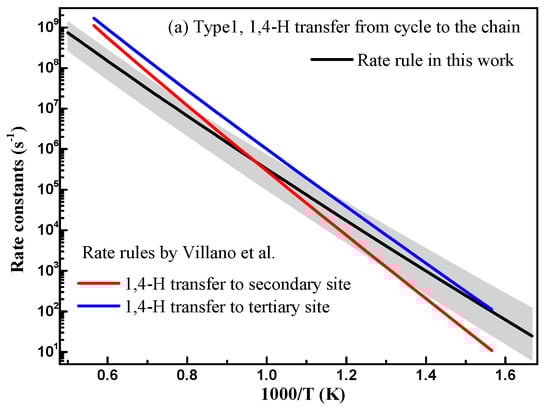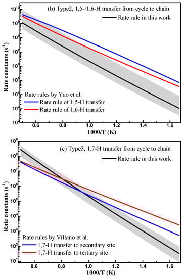 The rate rules for reaction classes involving H-migration from the cycle to side chain are shown in Figure 10. In each panel, the largest and smallest rate constants in each rate class are also depicted. Rate rules proposed in the literature are plotted for comparison. Figure 10a shows the rate rule for 1,4-H transfer from the cycle to side chain. The differences between the largest and smallest rate constants have factors of 3–20, suggesting that the uncertainty for the rate rule is 5. Since no rate rule for this class has been provided, the rate rules for 1,4-H transfer of the alkylperoxy radical proposed by Villano et al. were used for comparison with the present data. It can be seen that the rate rule for 1,4-H transfer to secondary sites provided by Villano et al. shows good agreement with the present rate rule, although the rate rule for 1,4-H transfer to tertiary sites provided by Villano et al. is two to five times greater. The agreement is likely coincidental, as most rate rules for chain alkylperoxy are not applicable to cyclic alkylperoxy. Figure 10b shows the rate rule for the 1,5-/1,6-H transfer reaction class. In this class, the 1,6-H transfer MCHR0OO to MCHR0OOH-3yl has the lowest rate constants, while the 1,5-H transfer BCHR0OO to BCHR0OOH-2yl has the greatest rate constants. The ratio between the greatest and lowest rate constants is about 25 and, therefore, the uncertainty for the rate rule can be estimated as 5. Yao et al. [] proposed separate rate rules for 1,5- and 1,6-H transfers from the cycle to chain, which are also plotted. The rate constants for the 1,5-H transfer rate rule provided by Yao et al. are 1.5–3 times greater than those of the same authors’ 1,6-H transfer class, but they are 4–60 times larger than those of the present rate rule. Figure 10c shows the range of the rate constants for 1,7-H transfer from the cycle to chain. The greatest rate constant for IPCHR0OO = IPCHR0OOH-4yl is three to five times that of the smallest values for PCHR0OO = PCHR0OO H-4yl. Hence, the uncertainty for the rate rule for this class can be estimated as 2.5. Due to the evident differences in the molecular geometries of the transition states of 1,7-H transfer for the chain alkylperoxy radical and those for the cycle to chain in the present work, significant disagreement can be noted between the present rate rule and those provided by Villano et al. []. This shows that the rate rules for chain alkylperoxy cannot be used for cyclic alkylperoxy radicals, as pointed out in the literature.